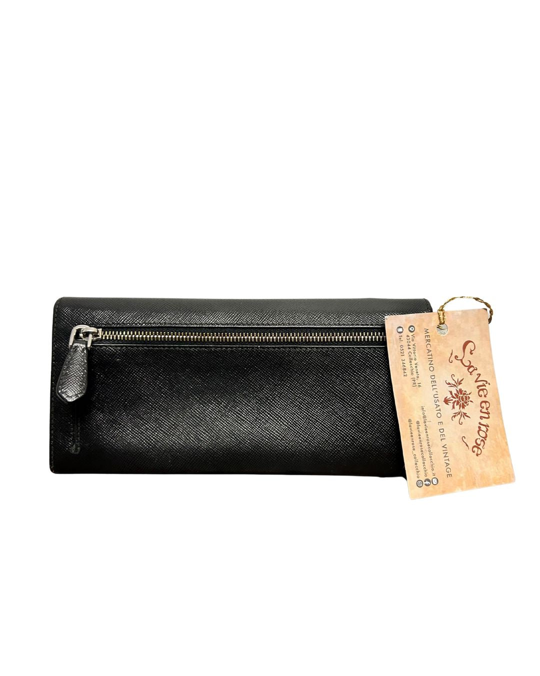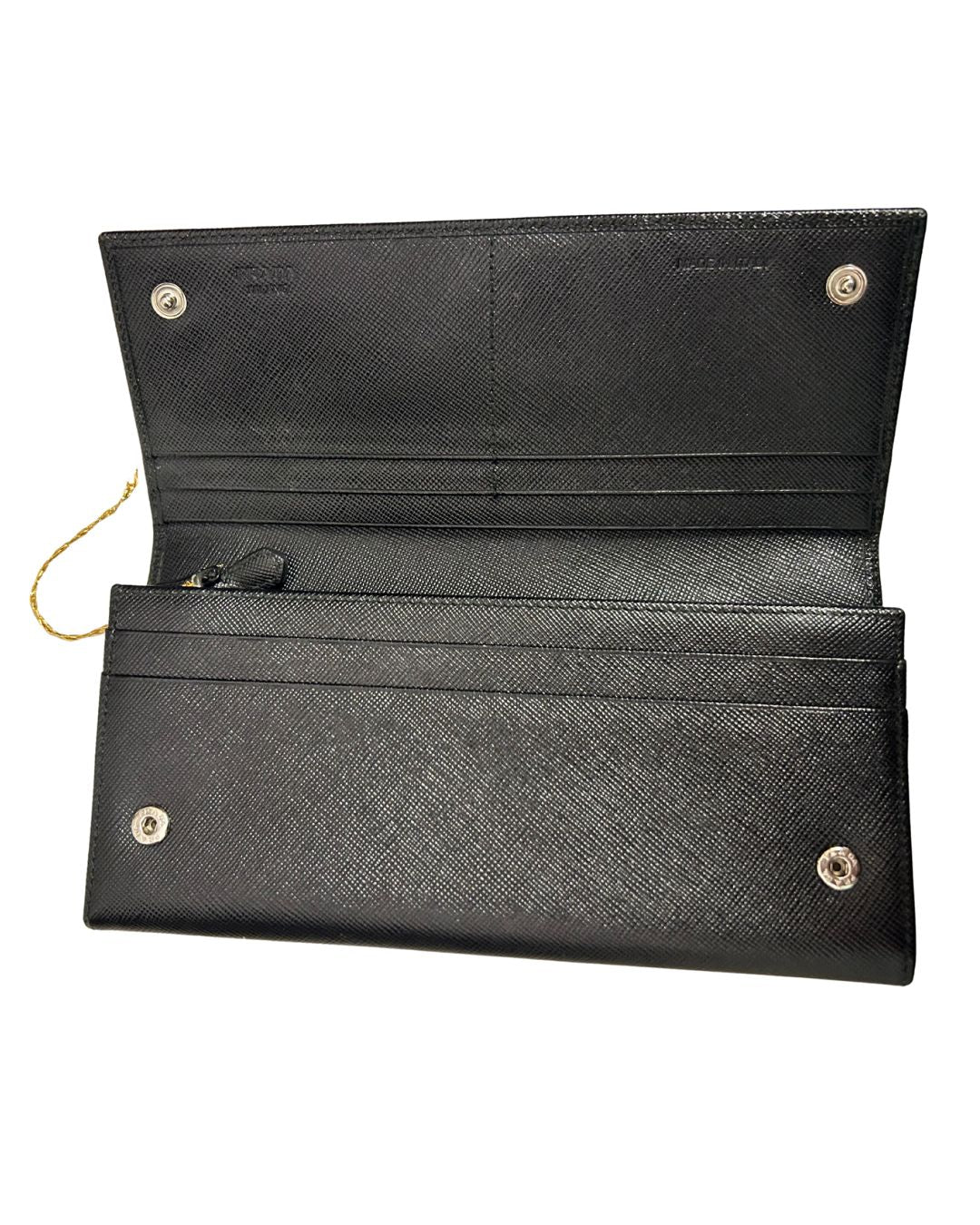 Portafoglio pelle safiano nero Prada, chiusura con bottoni magnetici, e taschino con zip all'interno